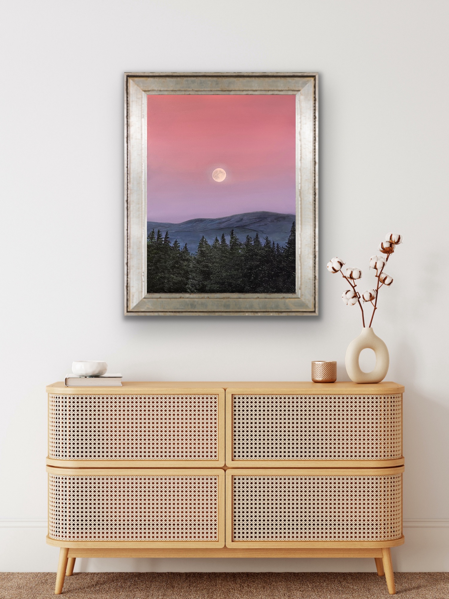 An original oil painting on stretched cotton canvas sized 16 inches x 12 inches…inspired by the full moon rising above a forest.