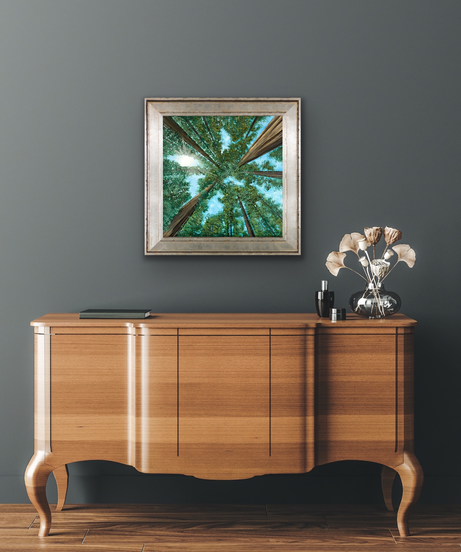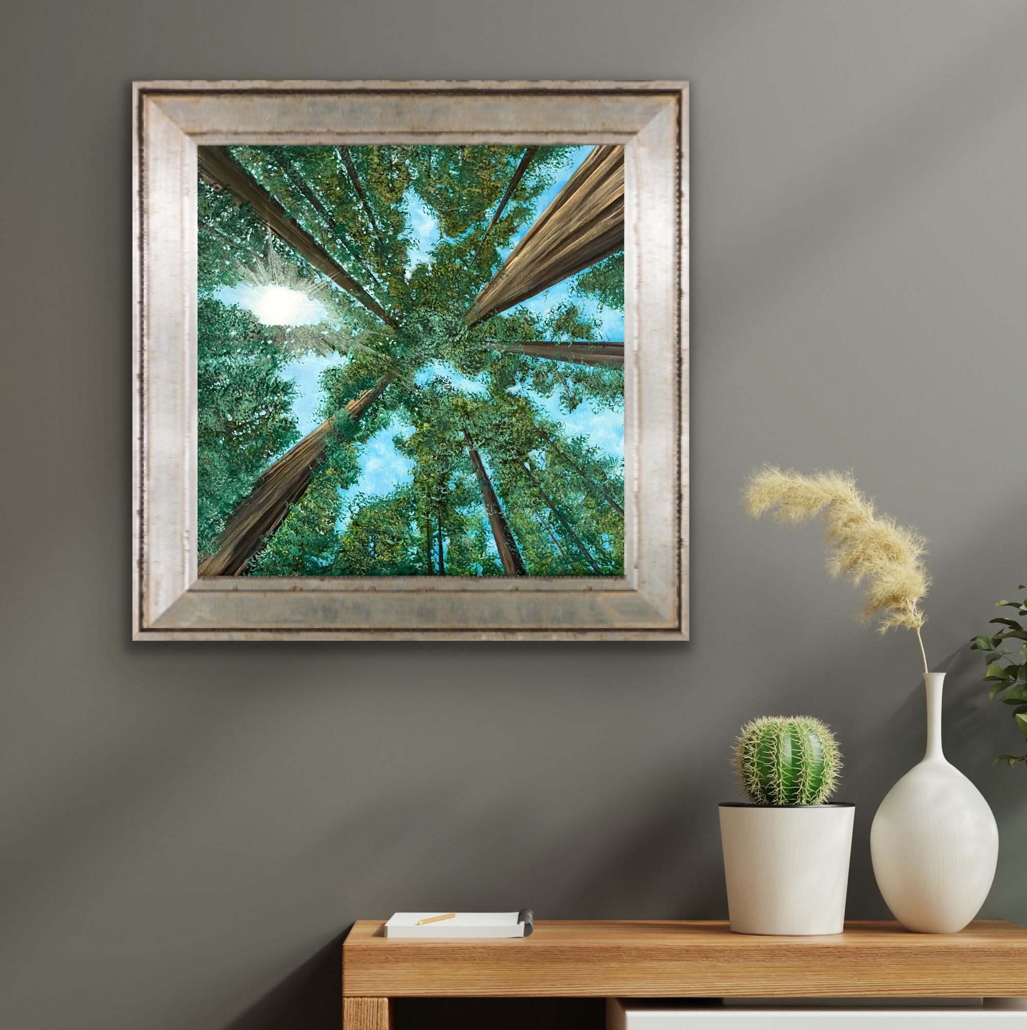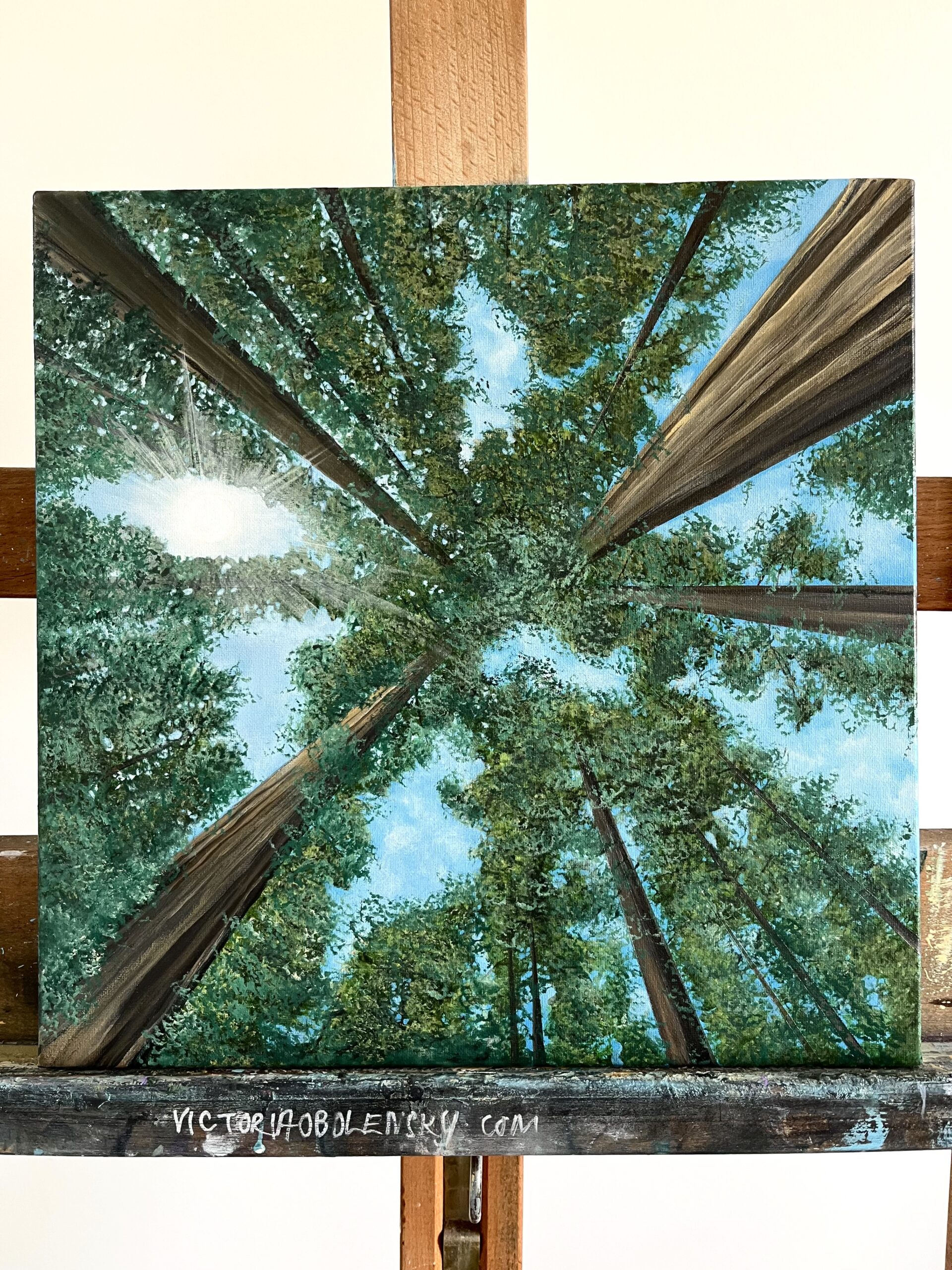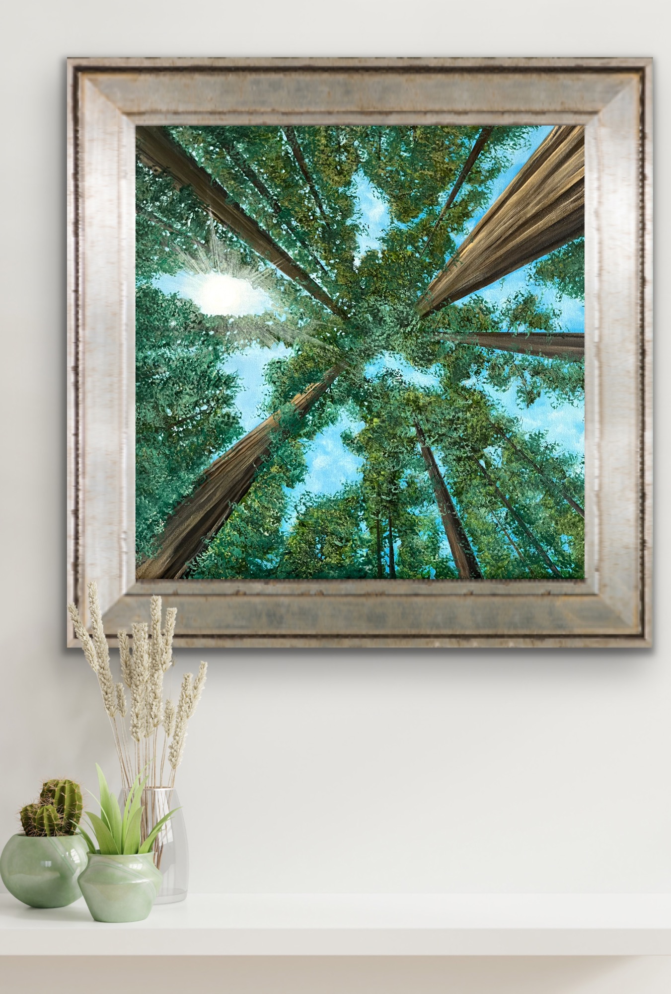 An original oil painting on stretched cotton canvas sized 30cm x 30cm…inspired by the sun pouring through the trees from above.