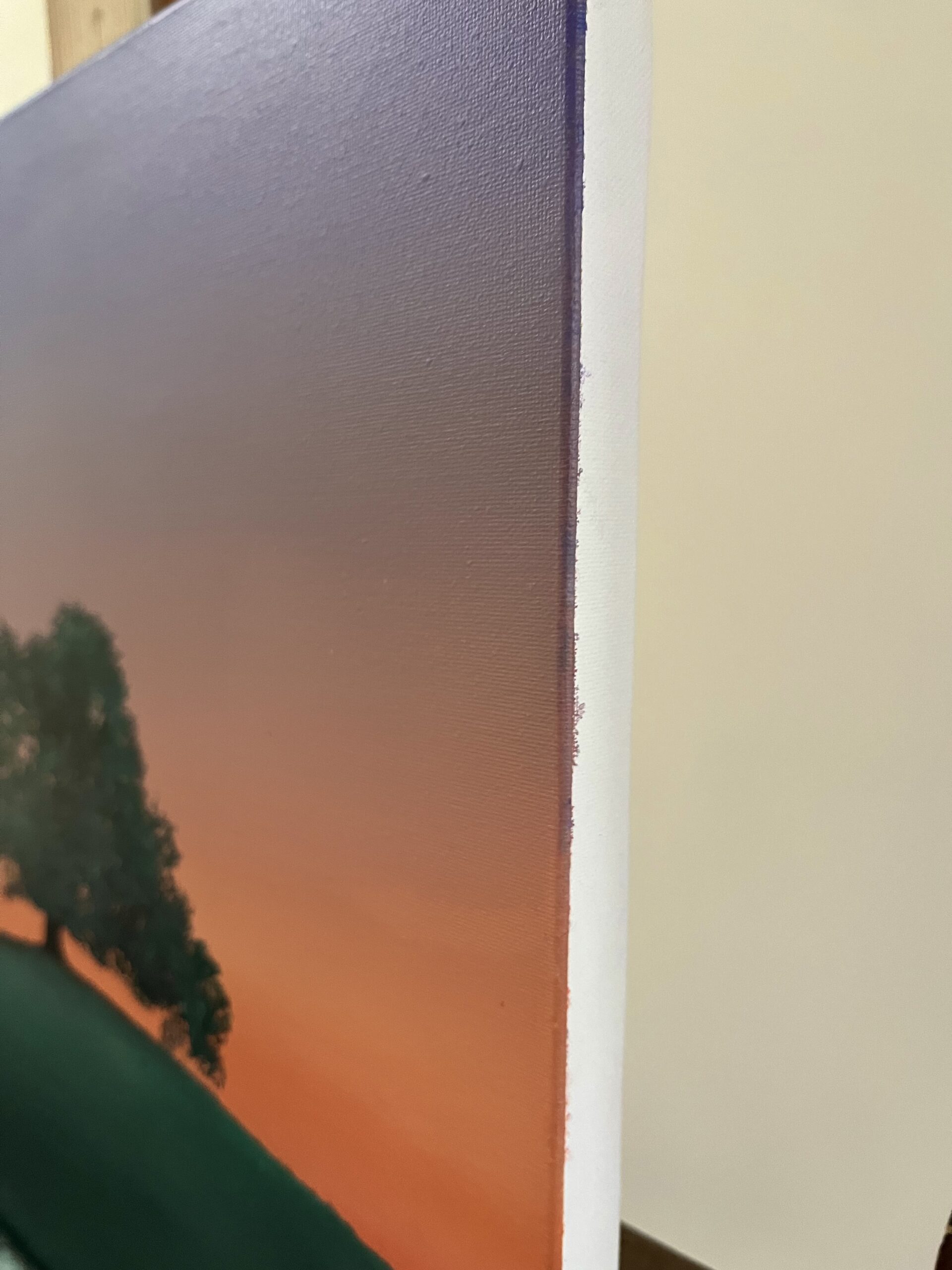 The sides of the painting are painted white. The painting comes with hanging fixtures and is ready to hang on the wall.