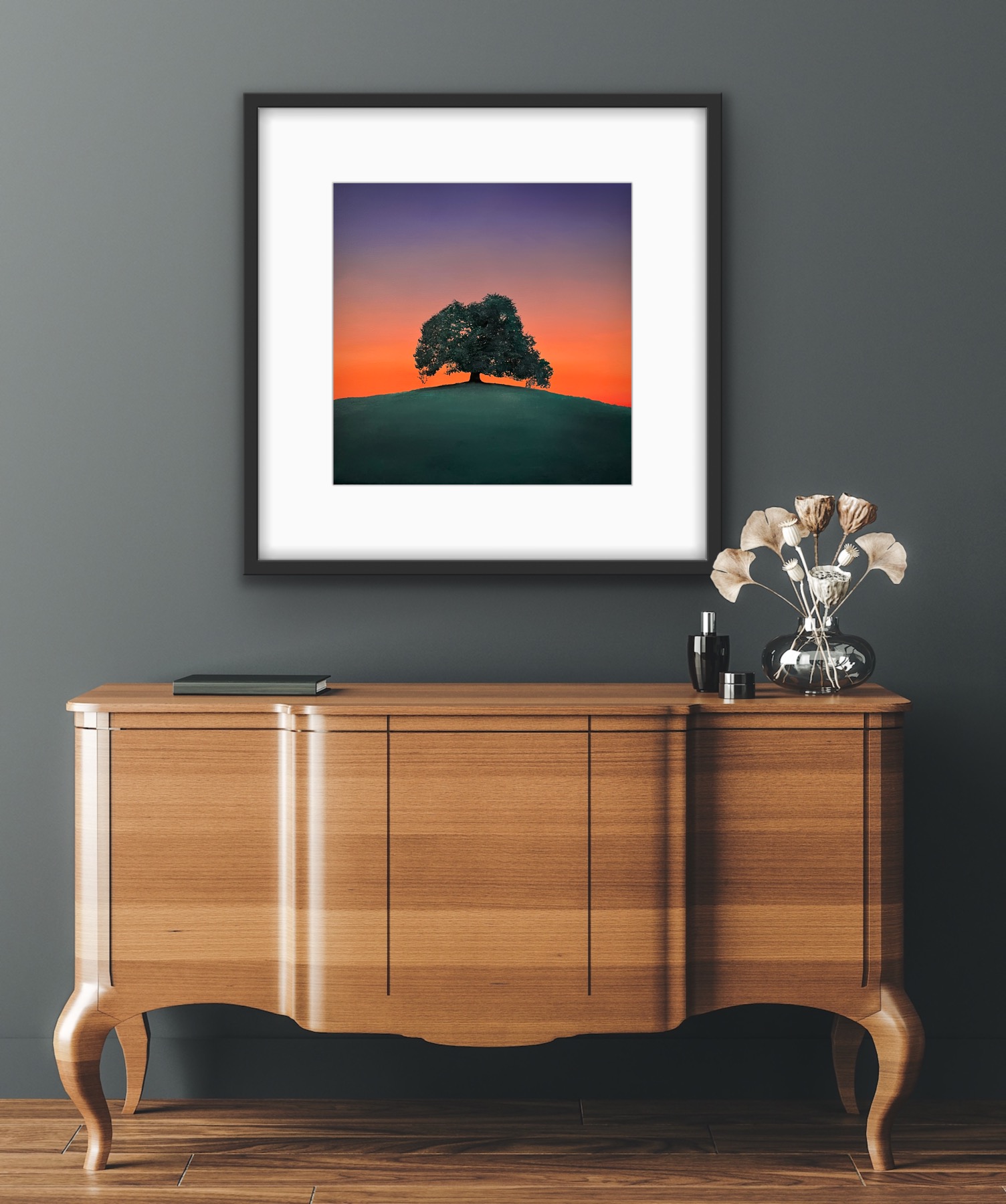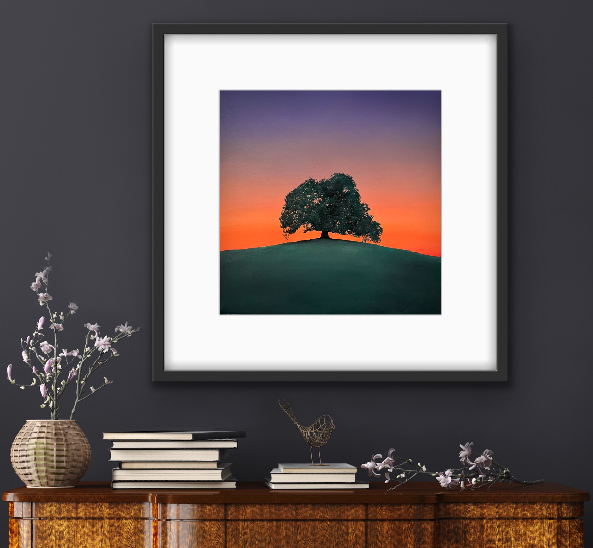An original oil painting on stretched cotton canvas sized 30cm x 30cm…inspired by a solitude tree at dusk.