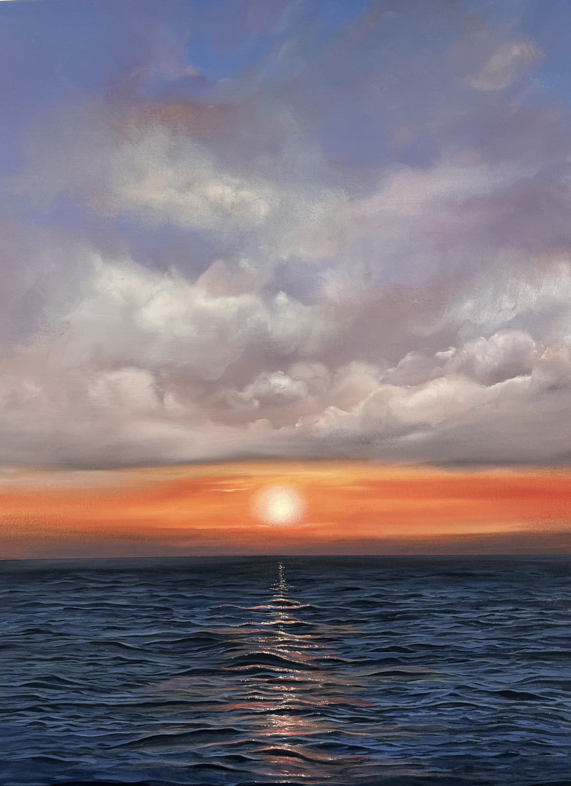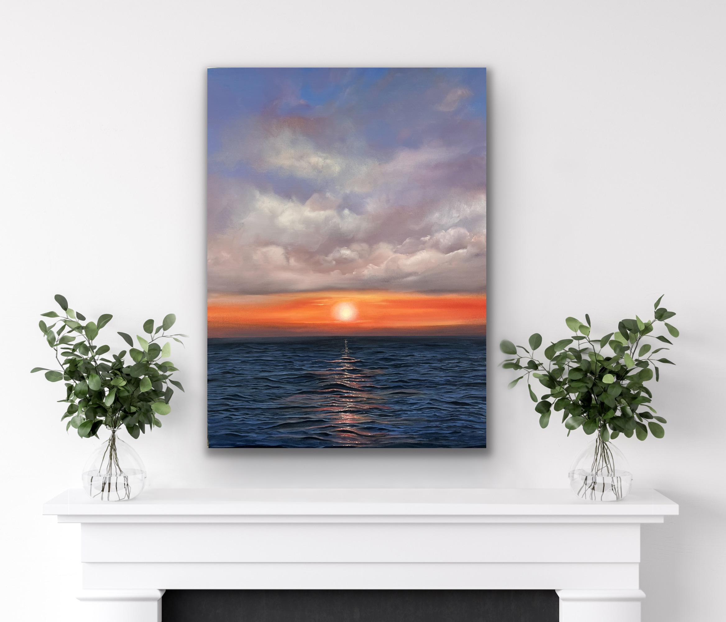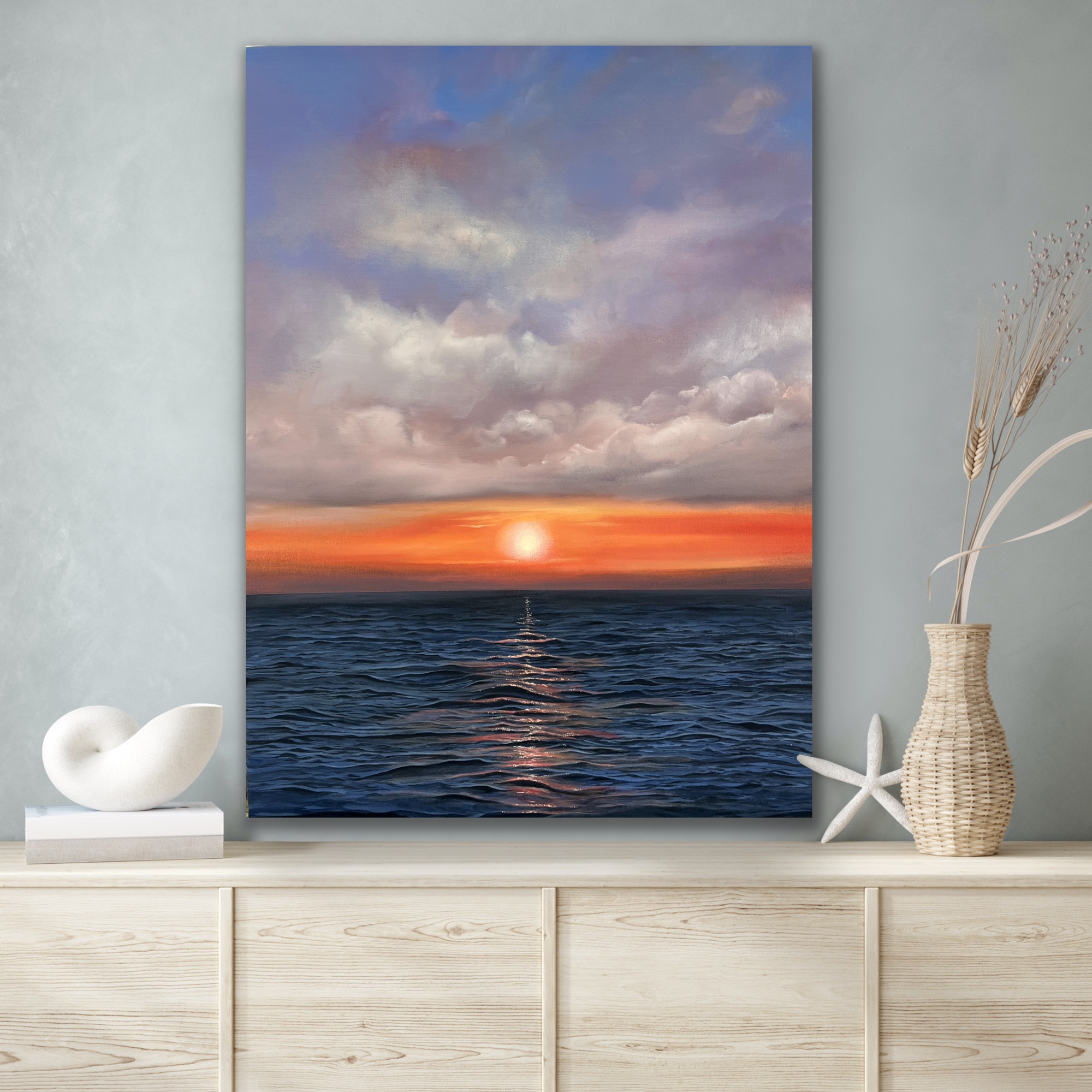 An original oil painting on stretched cotton canvas sized 16 inches x 12 inches, inspired by the sun rising above the ocean.