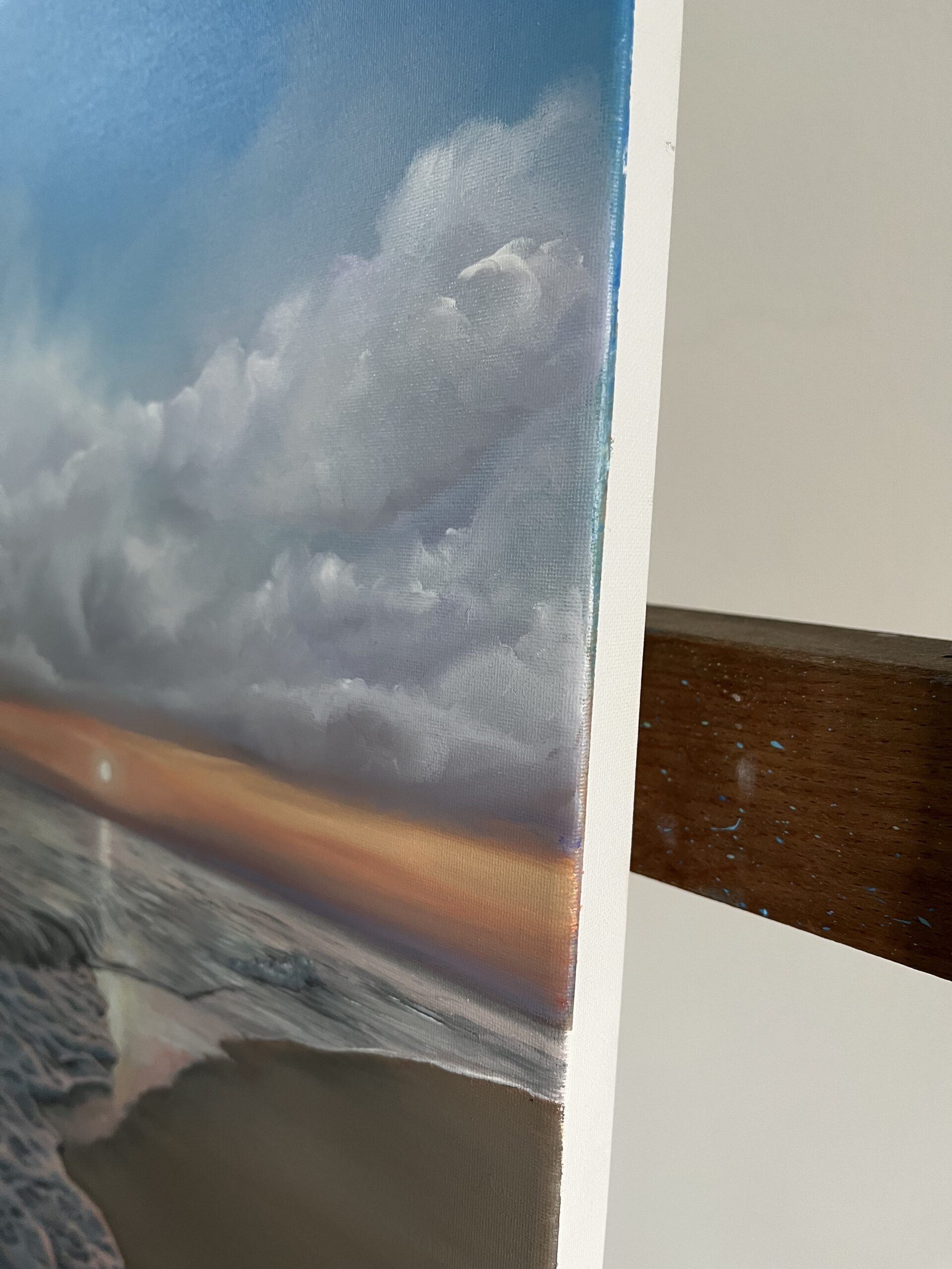 The sides of the painting are painted white. The painting comes with hanging fixtures and is ready to hang on the wall.