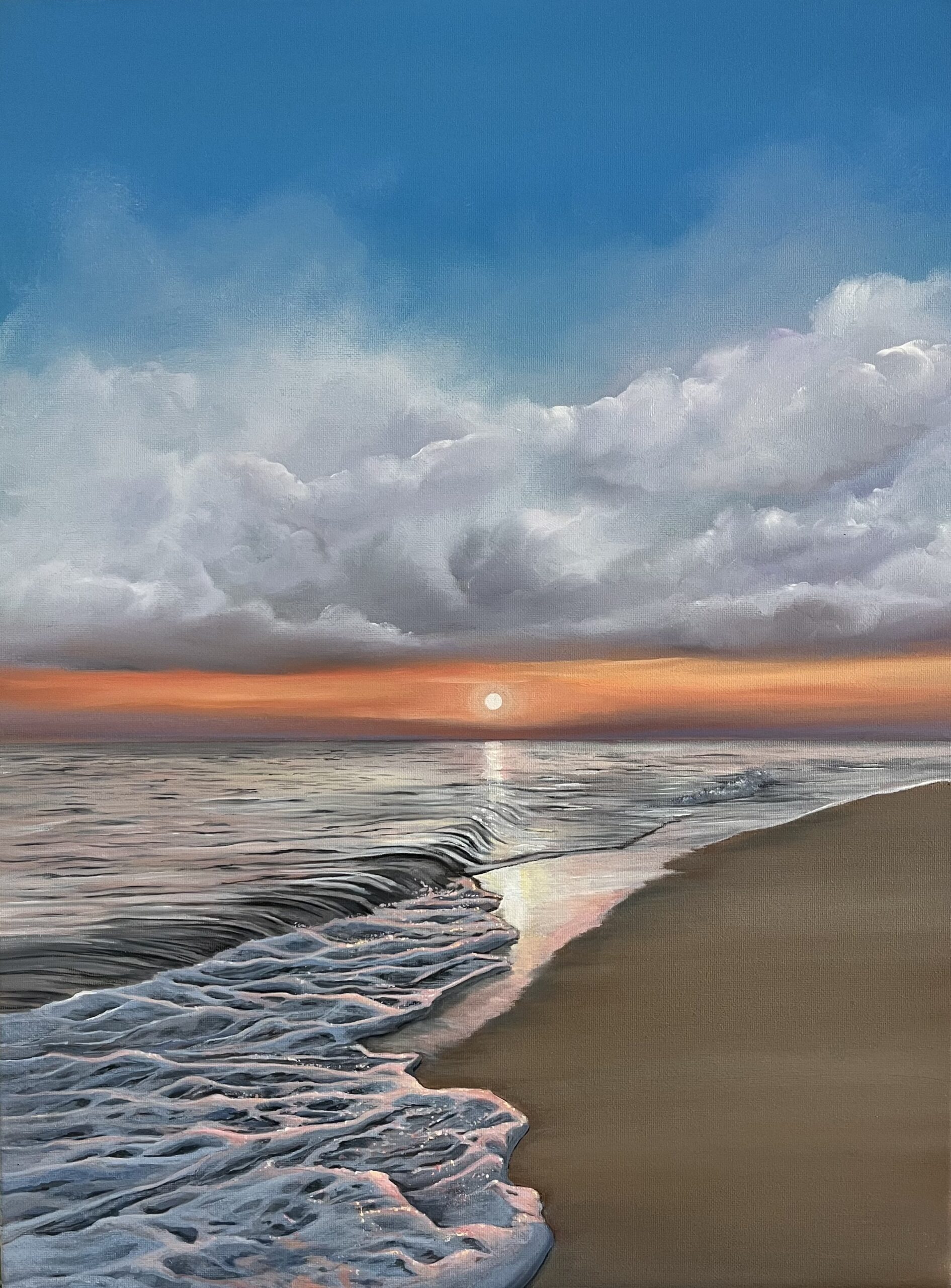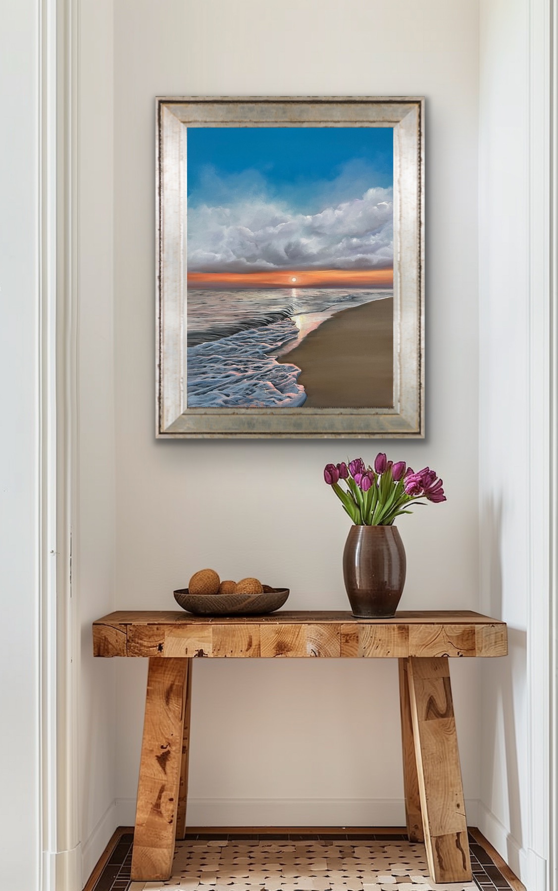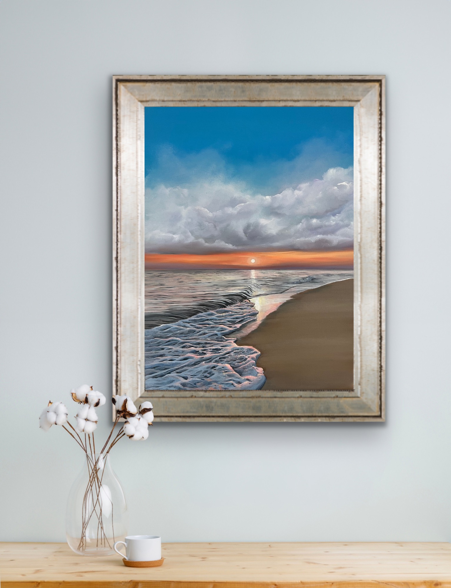 An original oil painting on stretched cotton canvas sized 16 inches x 12 inches…inspired by the sun rising above the ocean.