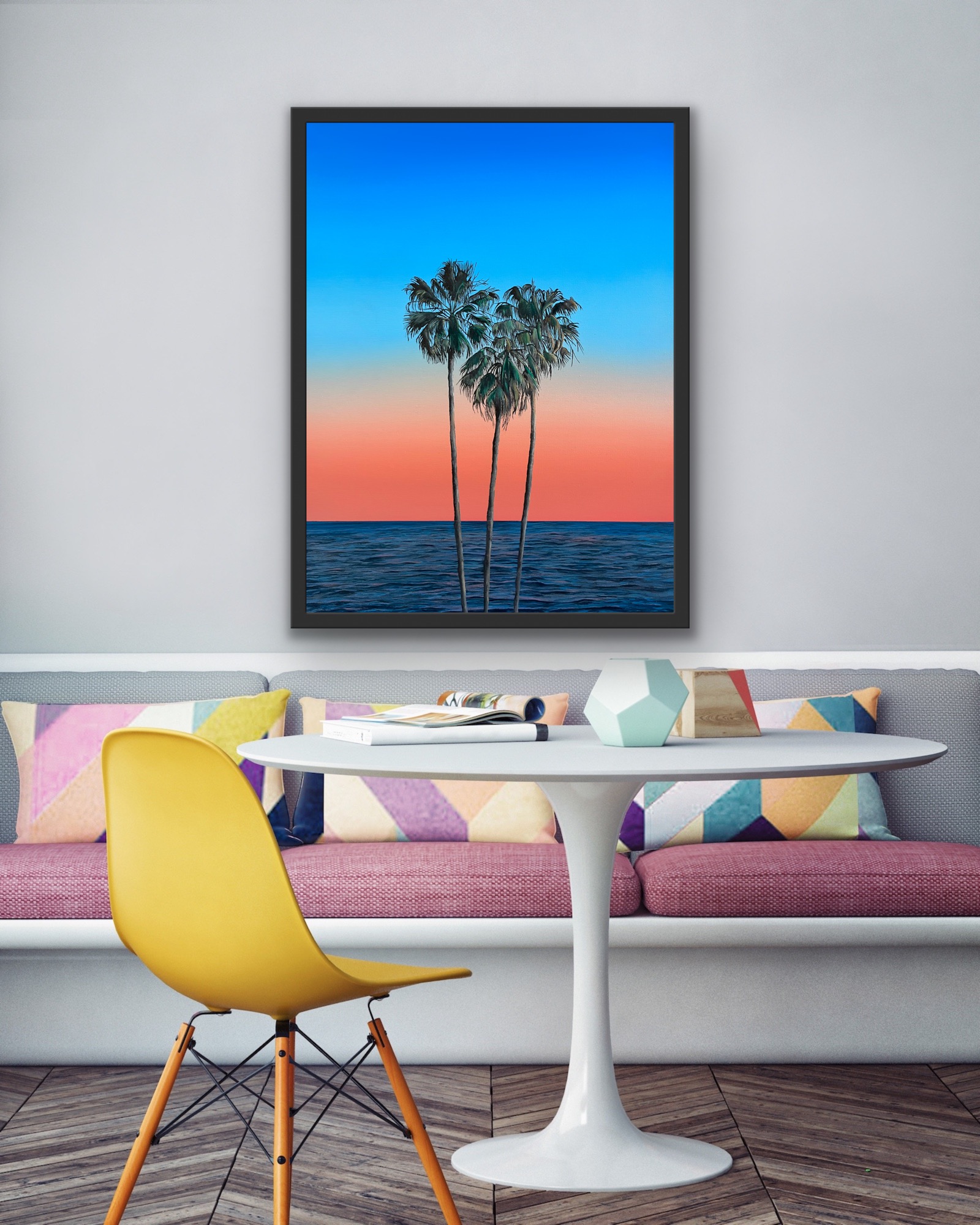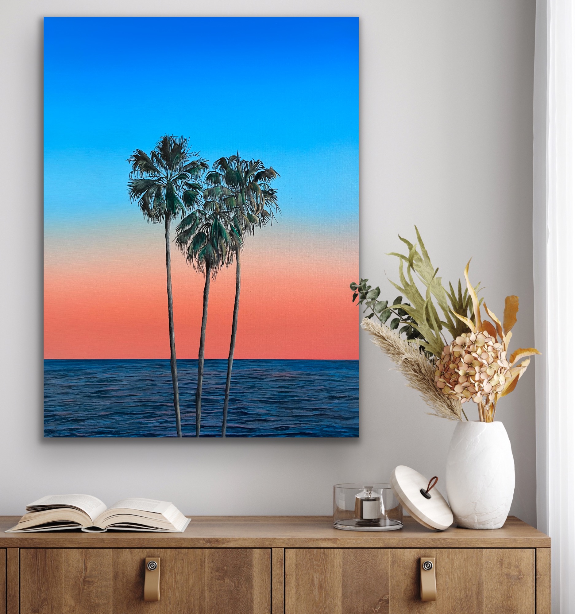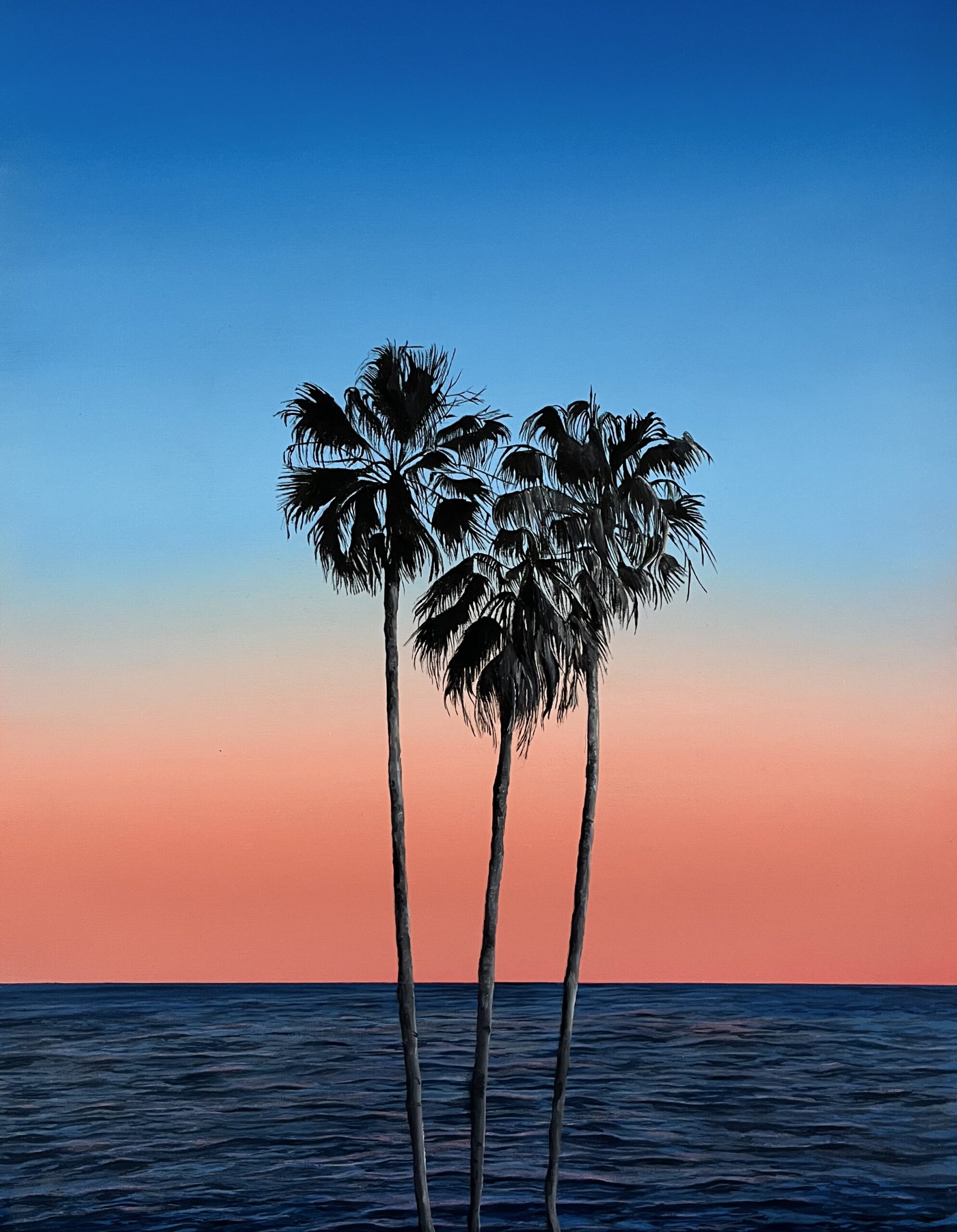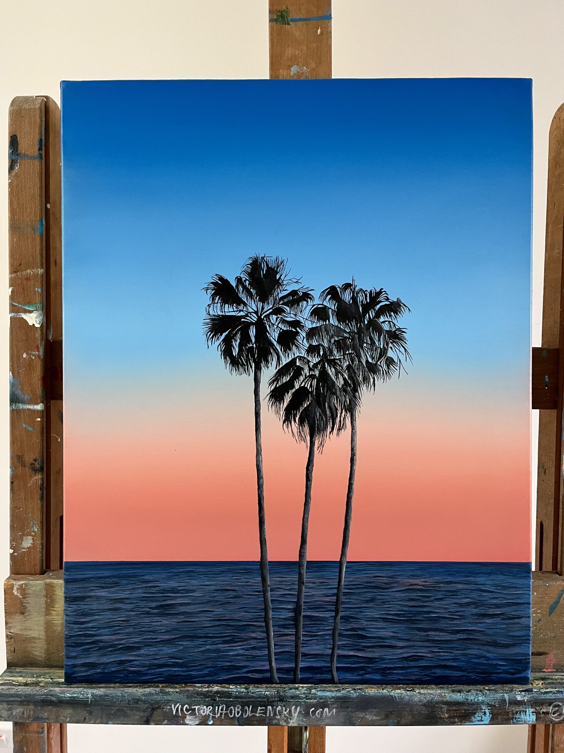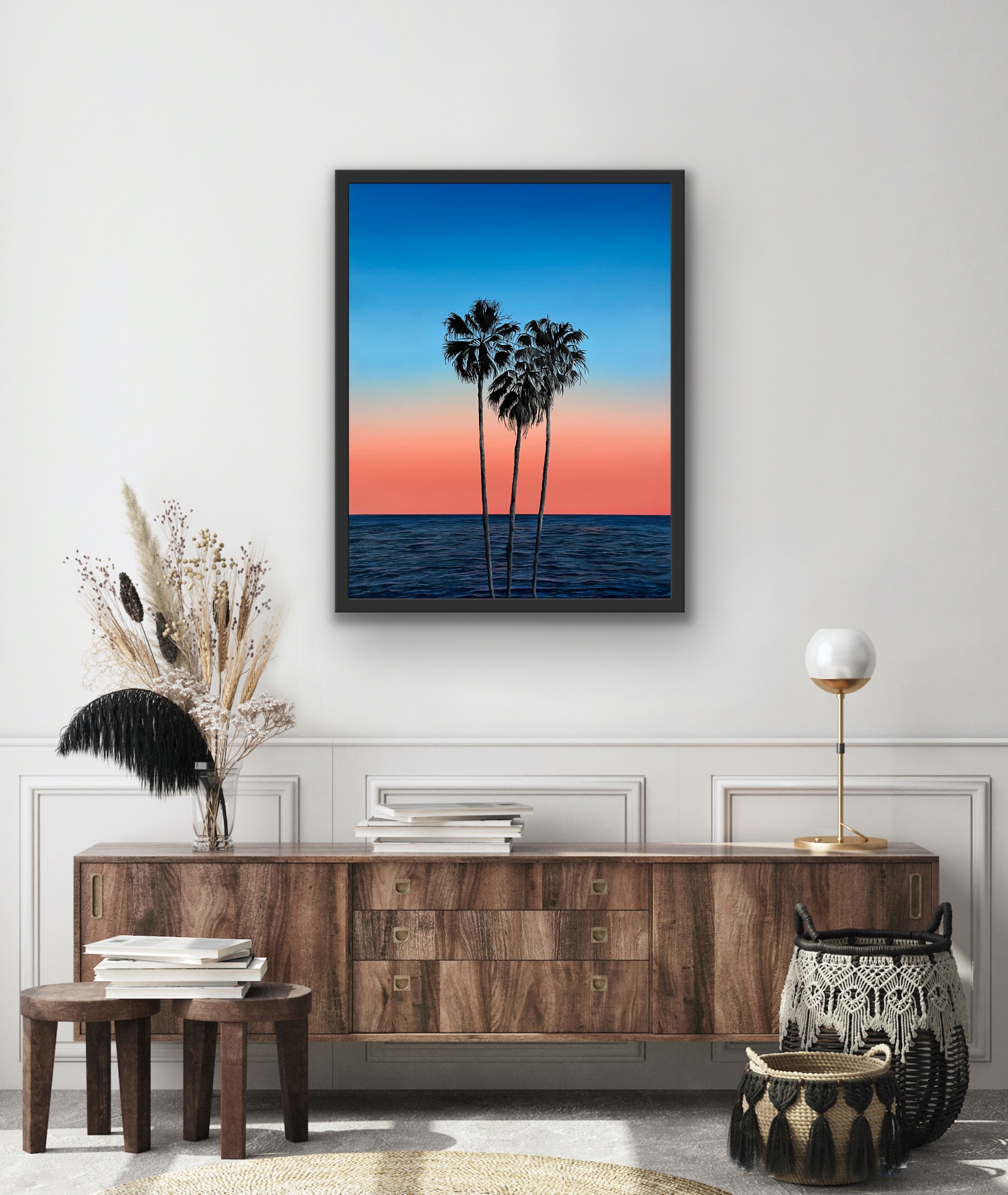 An original oil painting on stretched cotton canvas sized 45cm x 35cm…inspired by Palm trees at dusk.